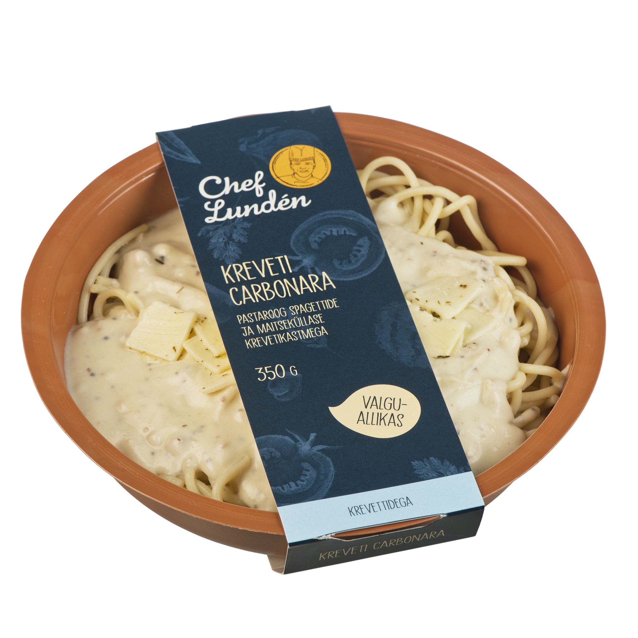vesi, spagetid (DURUM-NISUJAHU, vesi, võib sisaldada MUNA), laktoosivaba rõõsk koor (RÕÕSK KOOR, stabilisaator E407), krevetid 7% (KREVETID, vesi, sool), rapsiõli, juust (PIIM, sool, tärklis, juuretis, laap), peekon 2% (sealiha, sool, antioksüdant E301, säilitusaine E250, pöögipuu suits), NISUJAHU, küüslauk, sool, must pipar, tüümian.
